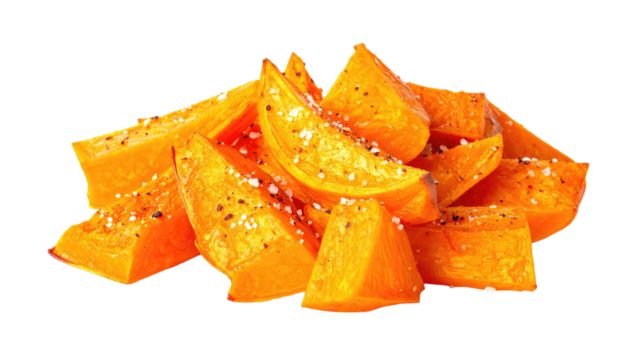 Golden roasted, seasoned squash chunks, arranged in a slightly overlapping pile, black background