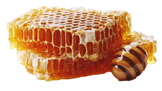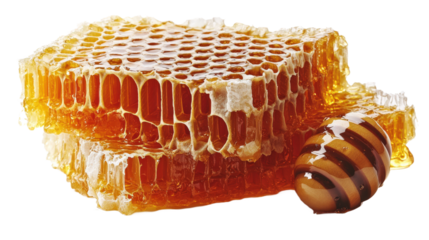 Golden honeycombs with rich, sticky texture and hexagonal structure, isolated on a transparent or white PNG background.