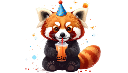 A cute cartoon red panda, wearing a party hat, enjoying a boba drink, on black