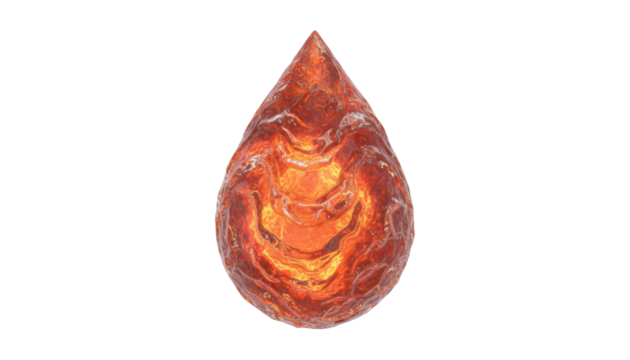 Glowing teardrop-shaped drop of molten lava with a fiery orange core and a textured, glossy, cooling surface showing intense heat and primordial energy