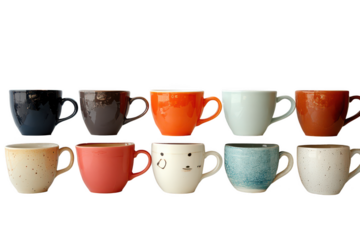 Assorted coffee cup collection. A variety of coffee cups in different colors and designs. Transparent background.