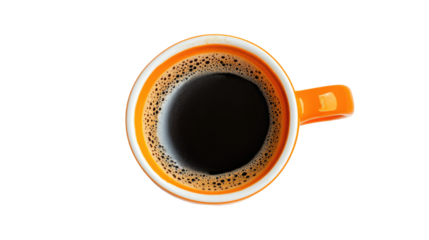 Hot Aromatic Coffee in Orange Cup on Saucer Morning Beverage Dark Roast Caffeine Energy Drink Mug on transparent background