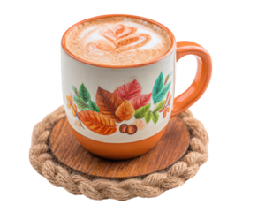 Autumn latte ceramic mug leaf pattern wooden coaster braided rope warm drink cozy seasonal cinnamon foam art orange cup rustic style inviting atmosphere