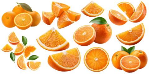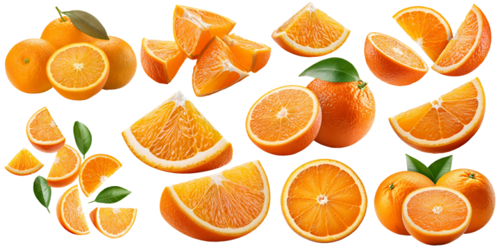 A vibrant orange with its peel spiraling away, captured in a dynamic splash of citrus juice against a clean transparent background with bright studio lighting.