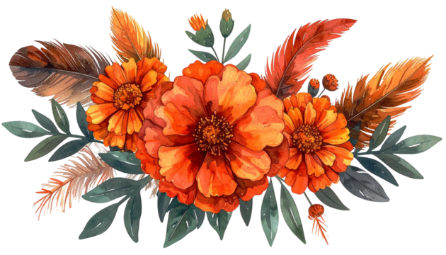 Watercolor floral arrangement with vibrant orange blooms and feathers