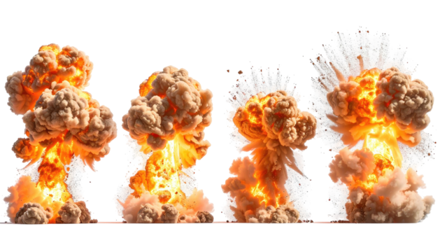 Large brown dust cloud explosion with bright orange fire at center on black background smoke, Png, Isolated on Transparent Background, Cut Out