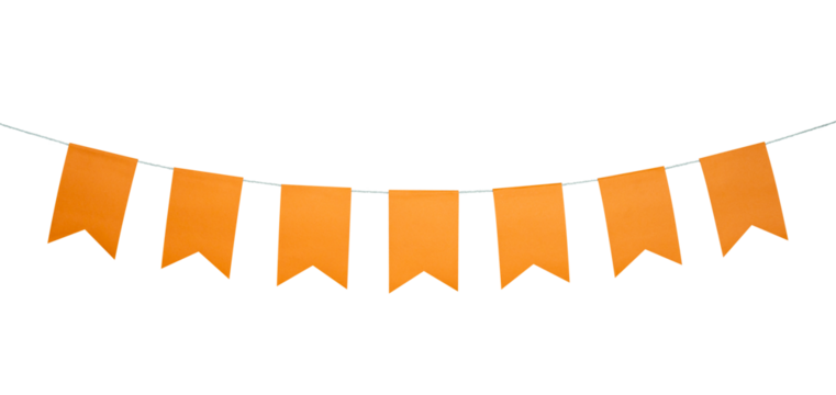 A bright orange triangular pennant flag blowing in the wind, isolated on a transparent background