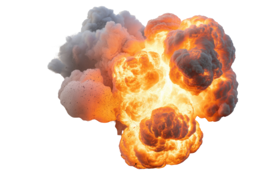 A dramatic explosion erupts with fiery orange flames and dark smoke. creating a powerful visual spectacle against a white background. ideal for action-themed media and graphic design projects