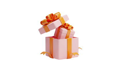 White gift boxes with elegant bows, one with black ribbon and other with orange ribbon, on transparency background
