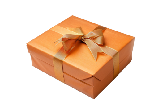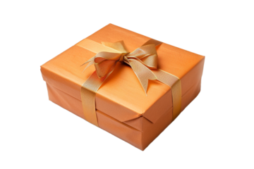 PNG of A beautifully wrapped orange gift box adorned with a white and gold ribbon, perfect for celebrations.