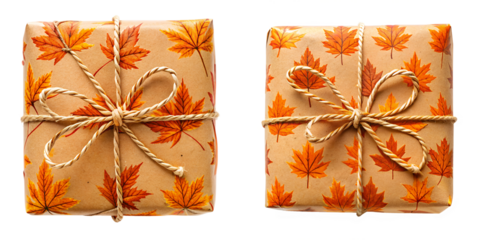 Orange gift wrapped in autumn kraft paper isolated on transparent background PNG file