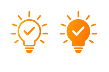 Two orange glowing light bulbs with checkmarks inside symbolizing ideas and success isolated on transparent background