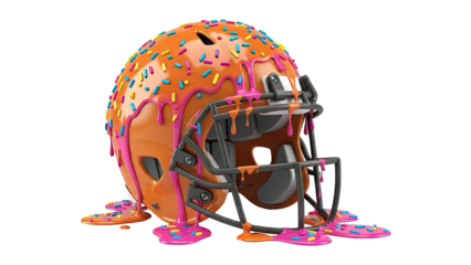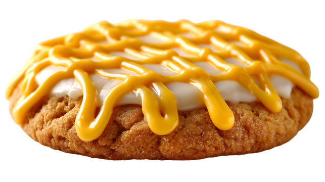 Cartoon donut with yellow icing and pink drizzle on transparent