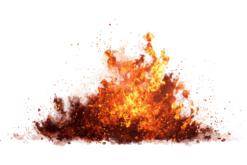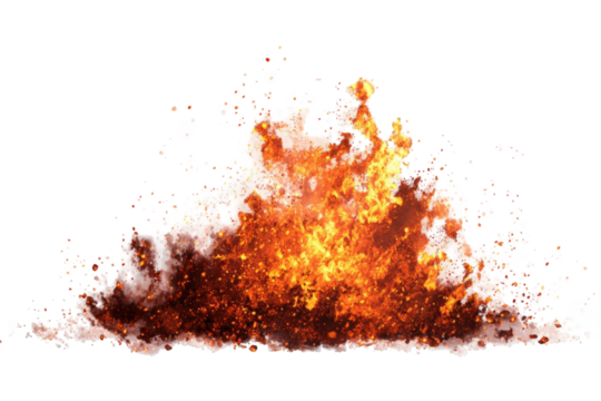 Large fire explosion with glowing embers, cinematic blast effect isolated on white background