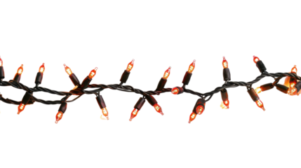 A festive string of colorful, glowing Christmas lights hanging on a wavy black wire against a plain white background.
