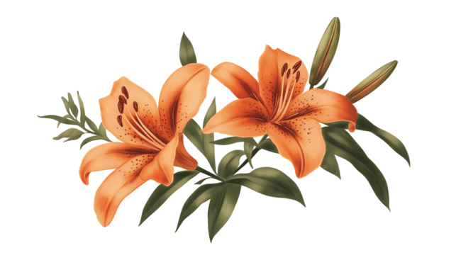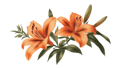 Elegant orange lilies with gray-green leaves on transparent background