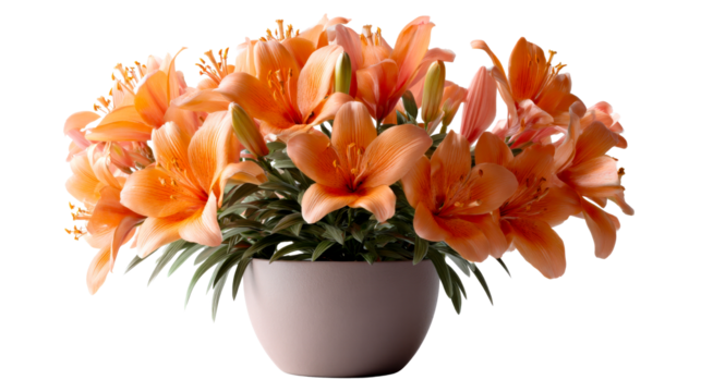 Lush potted plant featuring numerous vivid orange lily blossoms and green foliage perfect for home decor product displays or floral arrangement inspiration