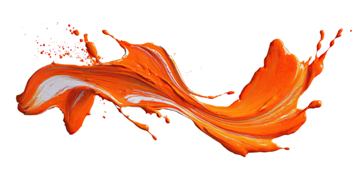 Vibrant orange liquid splash frozen in dynamic motion, forming an abstract fluid shape, perfectly isolated on a transparent background, ideal for energetic graphic designs