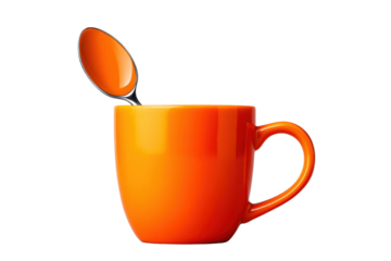 Bright orange coffee mug isolated on a transparent background. Perfect for beverage advertising, branding, or design purposes.