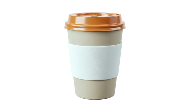 To-go coffee cup with orange lid and white sleeve