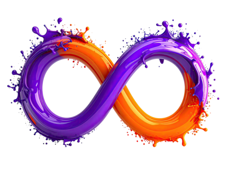 Infinity symbol formed of vibrant purple and orange paint with splatters
