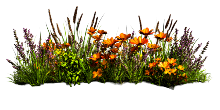 Assorted wildflowers and native grass patch arranged naturally, isolated on white background