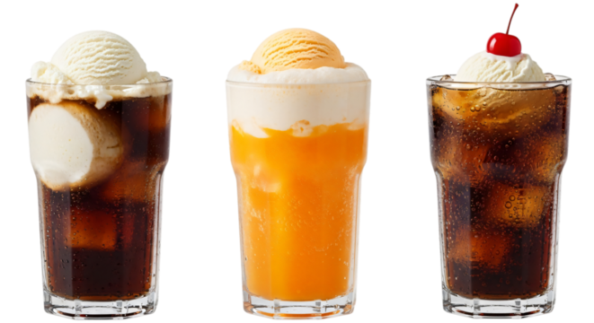 Hand holding a plastic cup filled with orange soda and ice on transparent background