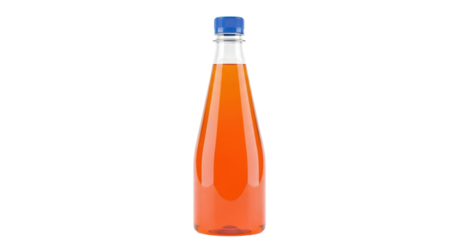 Isolated tangerine soda drink bottle with blue cap for refreshment on neutral surface