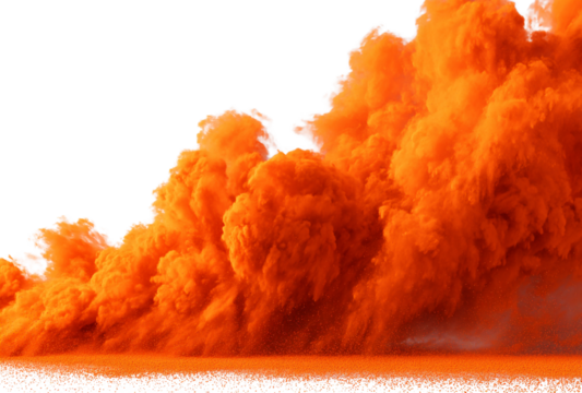 Bright orange powder explosion against a stark black background burst dust image, Isolated On Transparent Background, Png Cut Out
