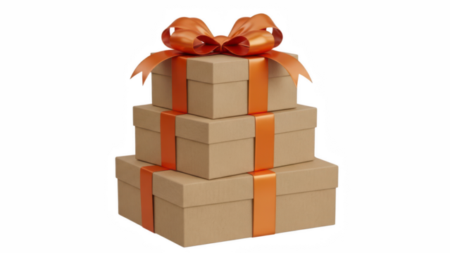 Stack of three brown gift boxes tied with a shiny orange ribbon and bow isolated on transparent background