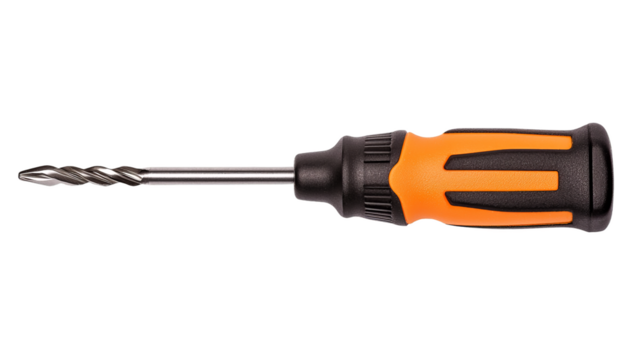 A screwdriver with a drill bit tip and an orange and black handle, isolated on a transparent background.