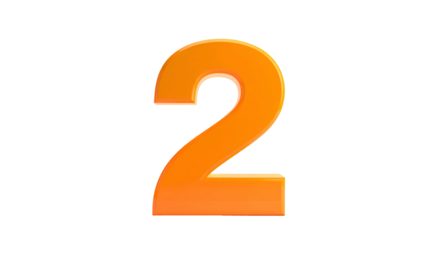 A vibrant, three-dimensional numeral two with a glossy, orange gradient, outlined in a darker shade, set against a black backdrop