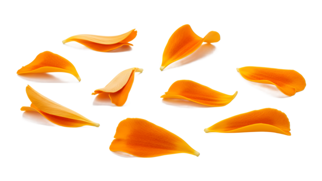 Scattered orange flower petals on a white background viewed from above