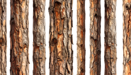 Close-up of vertical tree bark sections, showcasing textures and patterns, brown and orange