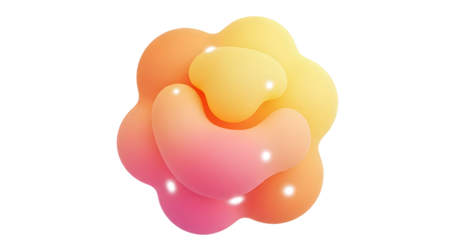 A vibrant, abstract, amorphous 3D shape with smooth, rounded forms and a gradient color transition from pink to orange to yellow. Glossy highlights and soft shadows add depth and dimension.