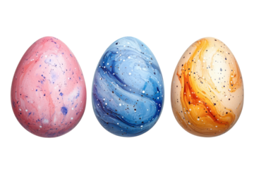Three vibrant Easter eggs pink blue and orange showcase beautiful marbled designs against a white