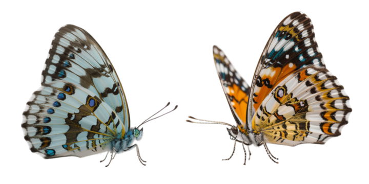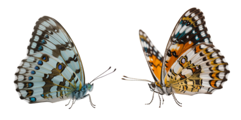 Two delicate and vibrant butterflies, one blue and one orange, showcase intricate wing patterns on a transparent background.