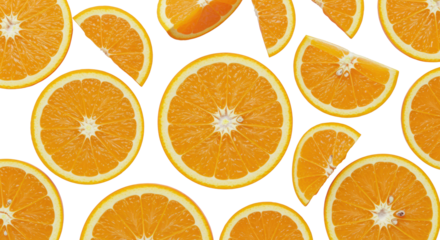 Fresh orange slices, half-rounds and wedges, showcasing vibrant juicy pulp and translucent zest on a transparent surface with soft studio lighting, concept of natural freshness and vitality