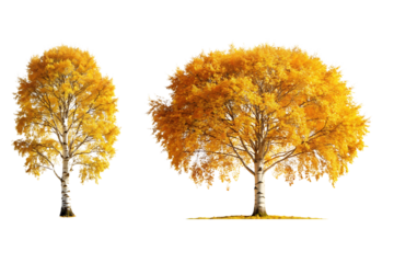 A birch tree with white bark and golden autumn leaves, Isolated on a Transparent Background