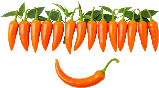 Eleven bright orange chili peppers with green leaves arranged above one pepper forming a smile isolate