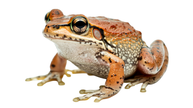 A vibrant blue and orange spotted tree frog posed gracefully on a white background.