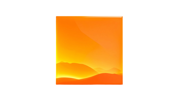 Glossy orange square showcasing a stylized landscape of rolling hills bathed in warm, luminous light and set against a dark background
