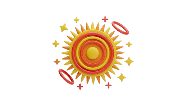 Vibrant stylized sunburst illustration with a central sphere, rendered on a black background