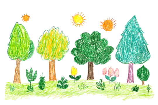 Childlike crayon drawing of a vibrant landscape with green, yellow, and teal trees, and orange suns against a transparent background