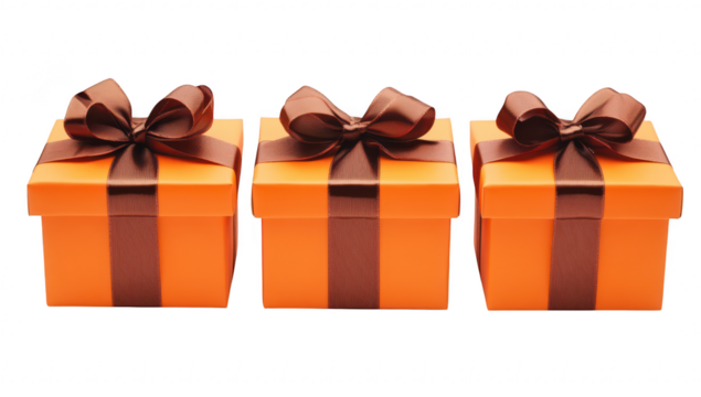 Three orange gift boxes adorned with elegant brown ribbons. arranged neatly on a clean white surface. symbolizing celebration and giving. perfect for holiday or event-themed visuals