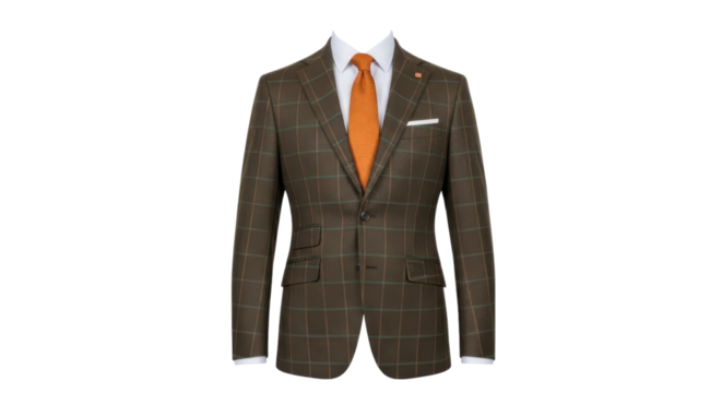Elegant brown checkered suit with orange tie displayed on a mannequin against a clean transparent background.