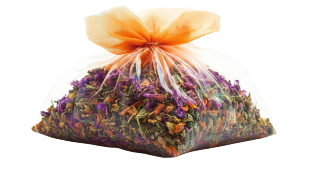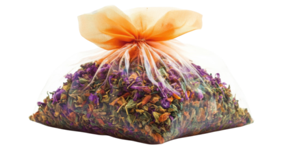 Dried herbal blend in a clear bag with orange tie showcasing vibrant colors and texture