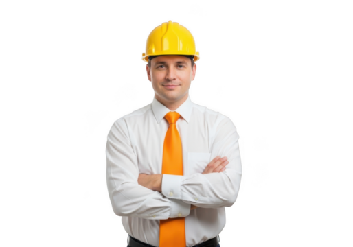 Professional male engineer wearing a yellow hard hat and orange tie standing confidently with arms crossed isolated on transparent background