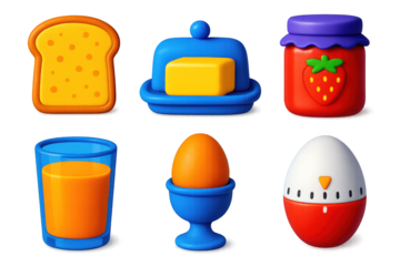Bold Breakfast Icons. 3D icon set of breakfast table: toast slice, butter dish, jam jar, orange juice glass, boiled egg in holder,