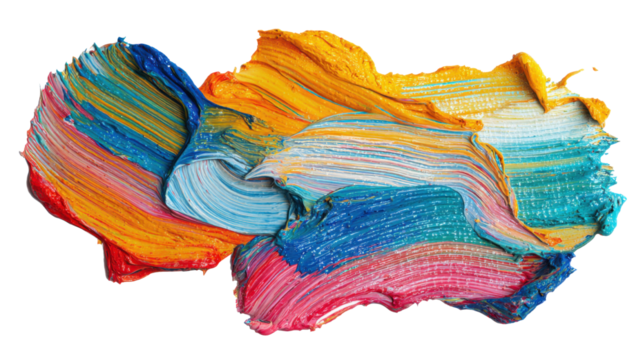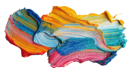 Vibrant abstract acrylic paint texture in bright blue, yellow, red, and orange tones showing artistic creativity and color blending on white background